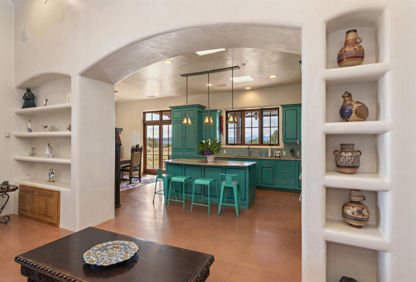 This distinctive 3B/4B Tierra Grande property enjoys sweeping mountain views in all directions with three portals to maximize the enjoyment its unique vantage point. Custom built by Anthony Odai, this home has been carefully maintained by its current owners since its completion in 2015. Clean, open-space living concepts combine with classic Santa Fe architectural details to render a home rich in style and comfort. White plaster walls, custom-built cabinets and doors, all LED lighting, and rich wood beams demonstrate assiduous attention to design detail. A generously-proportioned living room features high coved ceilings with vigas, clerestory windows and skylights over a colored concrete floor with turquoise stone highlights. Sliding doors facing southwest allow for natural light and lead to an expansive exterior covered portal with a kiva fireplace and automatic awnings. A large archway flanked by built-in shelving leads to the sizeable kitchen and dining area with painted wood cabinetry, large center island, quartz countertops, Wolf/Sub Zero appliances, skylights and sliding doors. A separate wing affords the master suite bed chamber and attached sitting room maximum privacy. A coved ceiling, vigas, turquoise bathroom tiles and kiva fire place bring many regional touches to bear upon this setting. Two guest bedrooms, each with its own ensuite bath, provide ample room for family and friends. State-of-the-art utilities are housed in over-sized two-car garage.