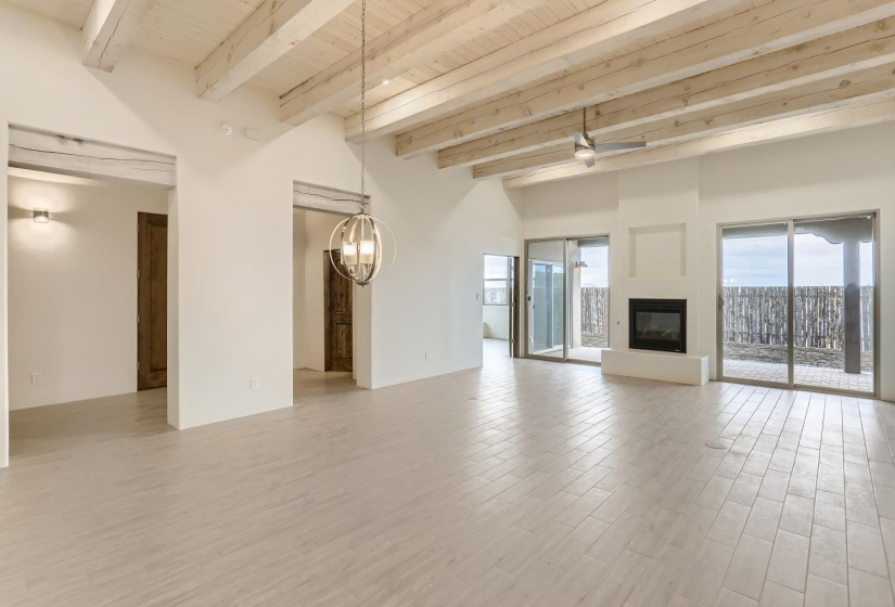 New Construction Ready for Occupancy! This San Isidro plan is a 2398 square foot 4 bedroom 2 ½ bath home located in La Pradera subdivision that has 50% open space and walking trails. The home has a partial clay tile roof with a stamped concrete driveway and brick pavers under the portals. Front yard landscaped with Santa Fe Brown gravel. Home has a west-facing covered portal adjacent to living room and bedroom/study with kiva fireplace. Main entry opens through 8 ft. high entry door, to a barrel-vaulted ceiling and lighted nicho. Powder room to left of entry and large hall closet to right. Entry, living room, kitchen and hallway floors are wood-tone porcelain planks. Living room has ceiling beams with T & G wood washed in a white stain. Open kitchen has a double oven, range, refrigerator and a walk-in pantry. An extra-wide hallway off of kitchen leads to 2 guest bedrooms and a covered portal with brick pavers. The Owner’s Suite is of generous size with a large walk-in closet and euro-style shower fixtures. A gracious utility room with cabinets and sink. 3 car finished garage.